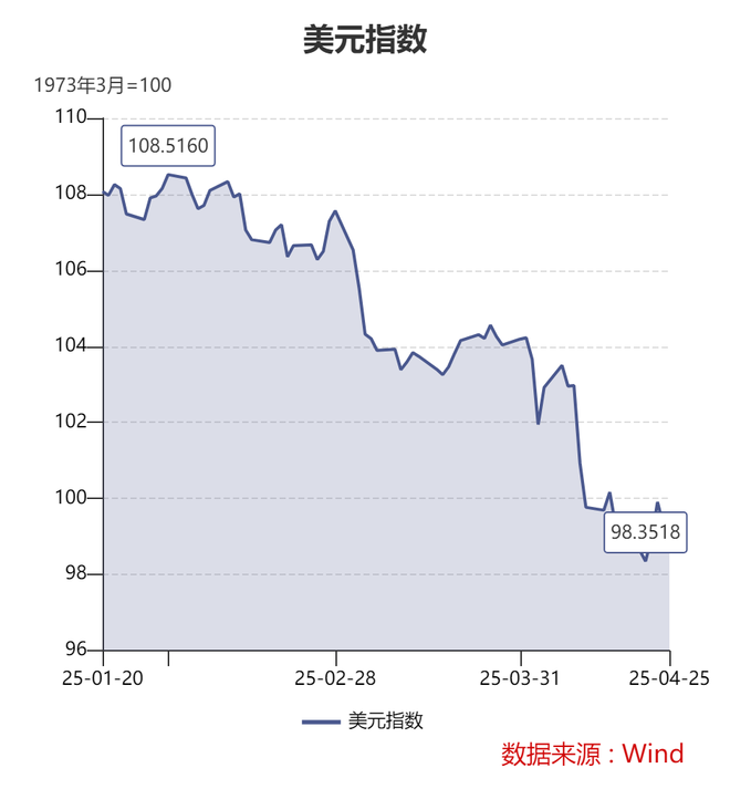 但由于特朗普向美联储施压,甚至威胁罢免鲍威尔,市场对美元的信心开始动摇。自1月20日(特朗普重返白宫)至4月25日,美元指数已下跌约9%,可能创下1973年以来美国总统任期前百天内最差纪录。