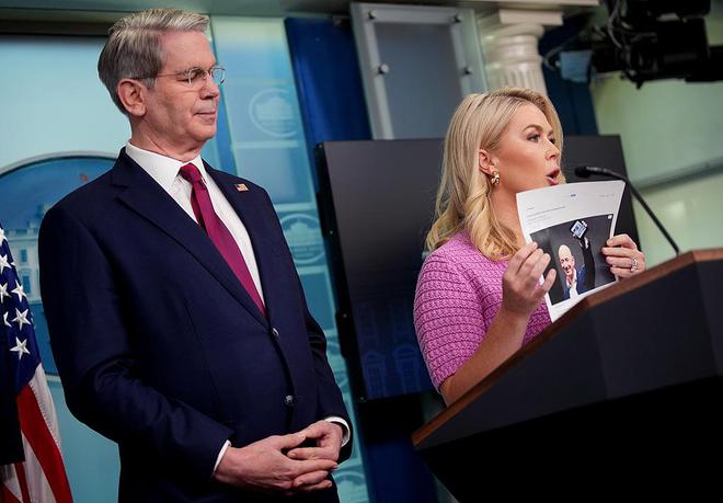 贝森特(左)出席白宫记者会