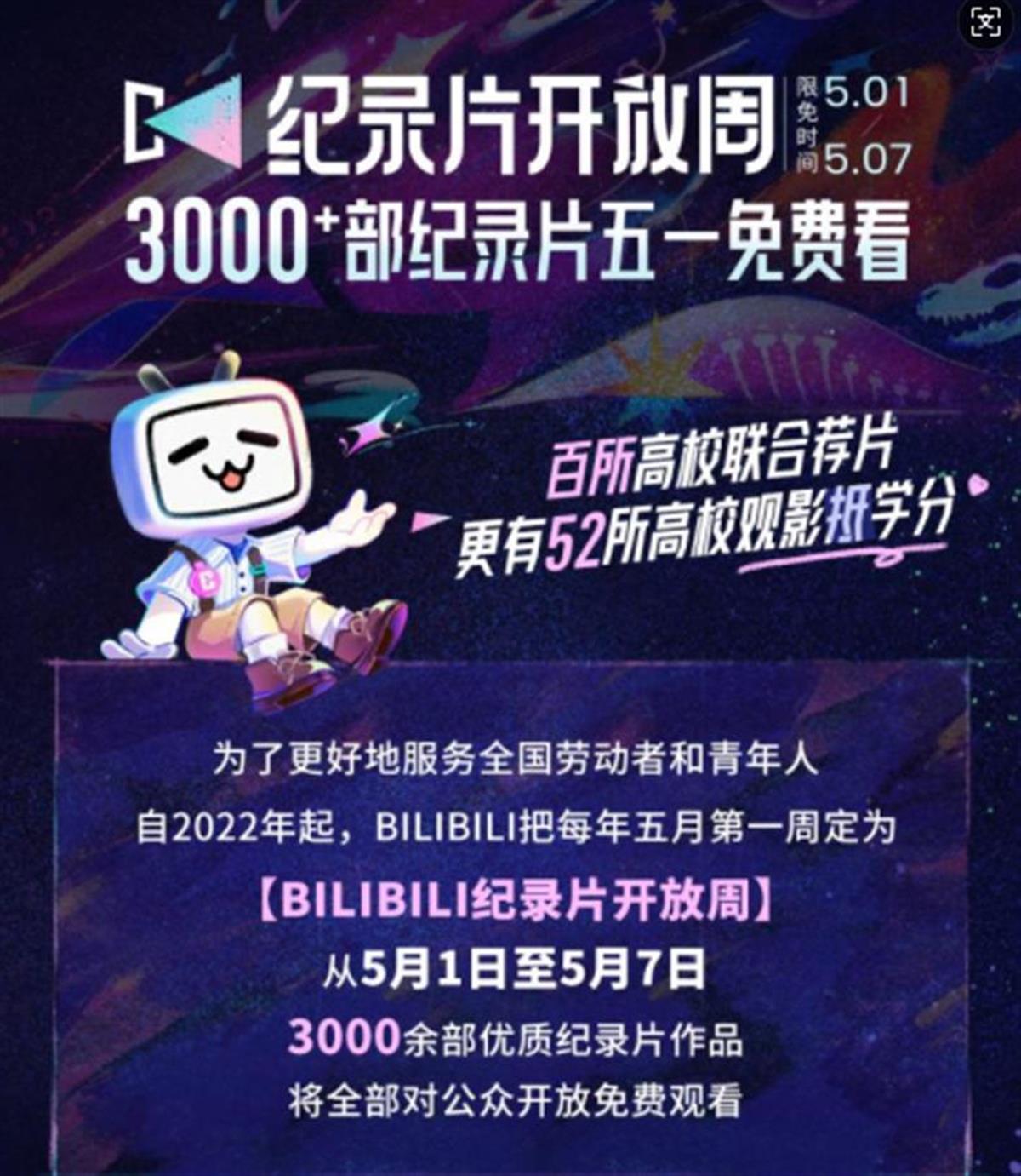 5月1日,哔哩哔哩(以下简称“B站”)正式开启第四届“纪录片开放周”活动。B站将联合清华大学、北京大学、复旦大学、上海交通大学等全国超百所高校,对外免费开放3400多部纪录片作品,在五一假期期间为全国劳动者和青年人提供丰富、优质的纪录片内容。