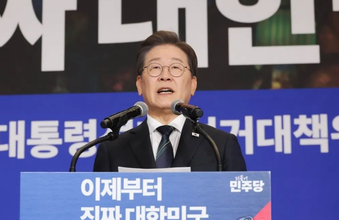当地时间4月30日,李在明在共同民主党总统选举委员会成立仪式上发表演讲