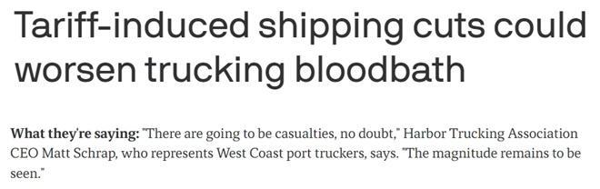 港口卡车运输协会首席执行官马特·施拉普表示,关税政策若继续下去,将严重影响整个物流行业,"卡车公司将失去业务,仓库也没有存储业务,甚至连码头装卸工也没有那么多工作了"。