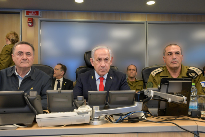 以总理内塔尼亚胡(中)、防长卡茨等人观摩了此次以军对也门的袭击