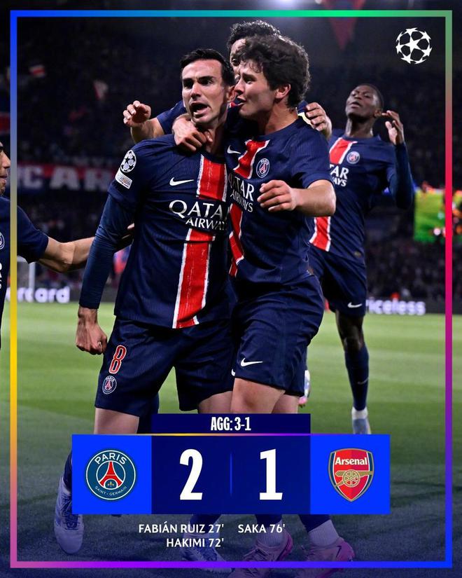 大巴黎2-1战胜阿森纳,总比分3-1完成双杀,挺进欧冠决赛