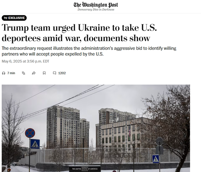 据美国《华盛顿邮报》5月6日报道,该报看到的官方文件显示,美国政府今年年初曾向乌克兰提出,让乌方接收被美国驱逐但并非乌克... 据美国《华盛顿邮报》5月6日报道,该报看到的官方文件显示,美国政府今年年初曾向乌克兰提出,让乌方接收被美国驱逐但并非乌克兰籍的第三国公民。报道称,对依赖美国军事、财政援助并处在军事冲突状态中的乌克兰而言,这一提议显得极不寻常。
