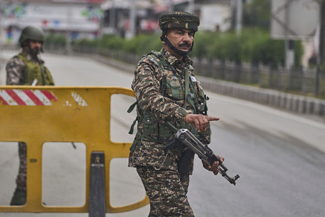 当地时间2025年5月10日,印控克什米尔,士兵在通往机场的道路上设立临时检查站,此前在斯利那加市传来巨响。图片来源:视觉中国
