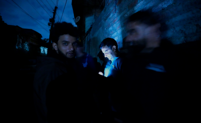 在印控克什米尔斯利那加,一名男子停电期间用手机查看实时新闻 图/新华社