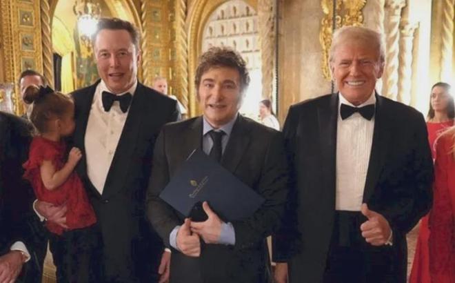 米莱到访海湖庄园,与马斯克(左)、特朗普(右)合影