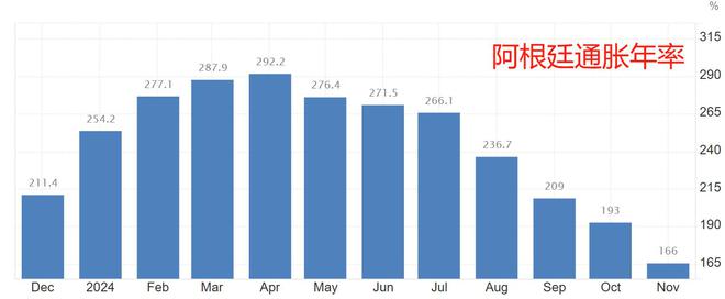 最新的数据显示,阿根廷今年11月的通胀月率降至2.4%,而在他去年12月上任时,这个数字为26%——相当于阿根廷人手里的钱,购买力刚过一个月就要贬值超过2成。按年计算,阿根廷的通胀率为166%。