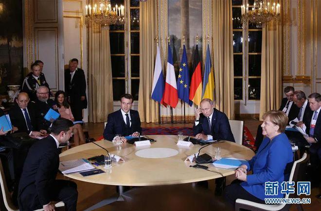 2019年12月9日,在法国巴黎,(从左到右)乌克兰总统泽连斯基、法国总统马克龙、俄罗斯总统普京和时任德国总理默克尔出席“诺曼底模式”四国峰会 图:新华网