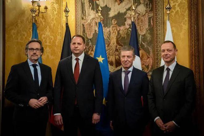 2022年1月26日,法国巴黎,俄罗斯谈判代表科扎克(右2),乌克兰代表叶尔马克(左2),以及法德代表举行“诺曼底模式”会谈