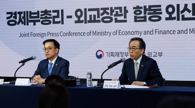 12月18日,韩国外交部长官赵兑烈(右)与企划财政部长官崔相穆共同出席新闻发布会(图源:外媒)