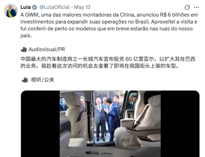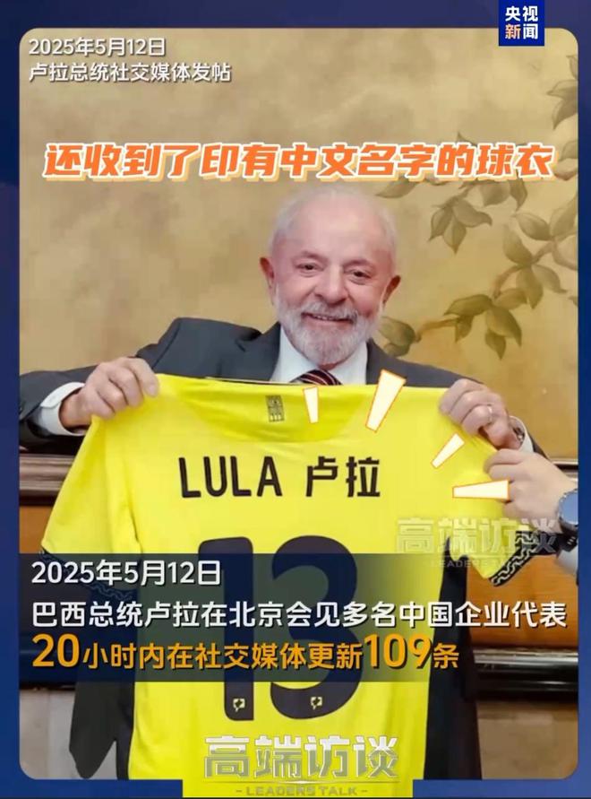 据央视新闻报道,巴西总统卢拉5月10日晚间抵达北京,开启对中国的国事访问。12日,卢拉在北京会见多名中国企业代表,20小... 据央视新闻报道,巴西总统卢拉5月10日晚间抵达北京,开启对中国的国事访问。12日,卢拉在北京会见多名中国企业代表,20小时内在社交媒体更新109条。