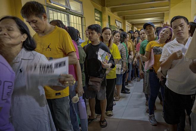 当地时间2025年5月12日,菲律宾马尼拉,选民在一所改建为投票站的学校外排队等候投票,参与中期选举 图/视觉中国