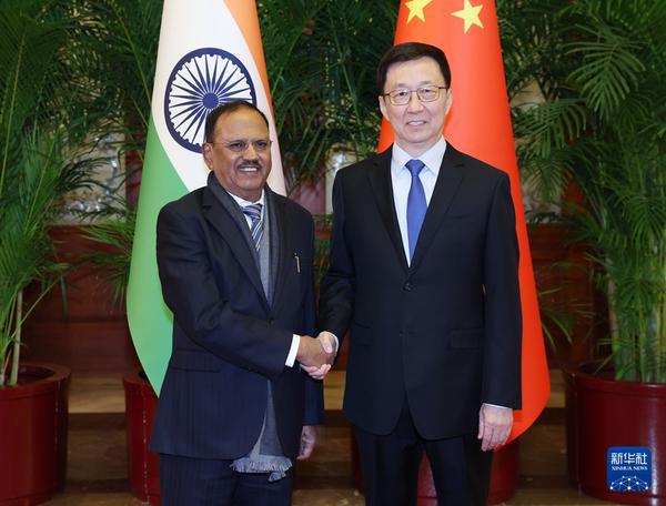 12月18日,国家副主席韩正在北京会见印度国家安全顾问、中印边界问题印方特别代表多瓦尔。