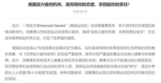 据央视新闻,当地时间5月22日,世界反兴奋剂机构 (WADA) 发表声明,表示,“增强运动会”是一个危险且不负责任的赛事概念。这项赛事会危及运动员的健康和福祉,它试图鼓励运动员使用强效药物,达到娱乐和营销目的。同一天,世界反兴奋剂机构 (WADA) 运动员委员会也发表声明,强烈反对“增强运动会”的举行。