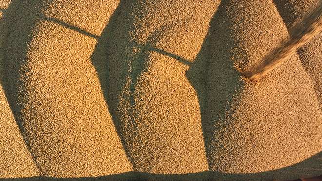 10月19日,北大荒集团黑龙江荣军农场有限公司一家粮食处理中心在清理精选大豆(无人机照片)(图/新华社发)