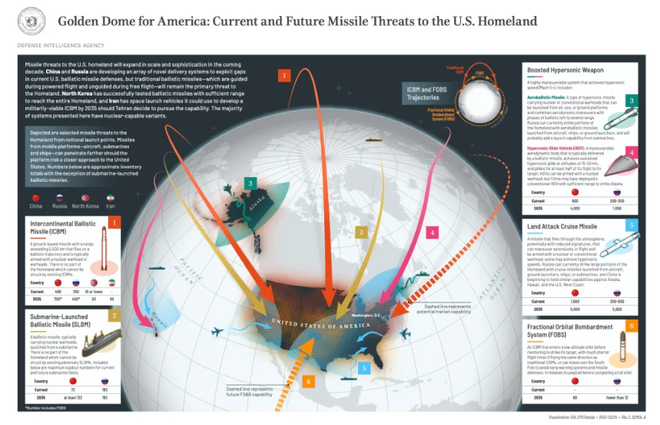 至于为什么该系统将天基跟踪和拦截看作是“重中之重”,报道提到,美国国防情报局最近发布一份题为《美国“金穹”》的非机密评估报告,强调“美国对手如何利用各种弹道导弹、远程巡航导弹、轰炸机和高超音速导弹瞄准美国本土”。根据五角大楼的规划,为了消除这些针对美国的威胁,最理想的方案就是在它们刚起飞时,即在所谓导弹飞行的助推阶段就将其击落。