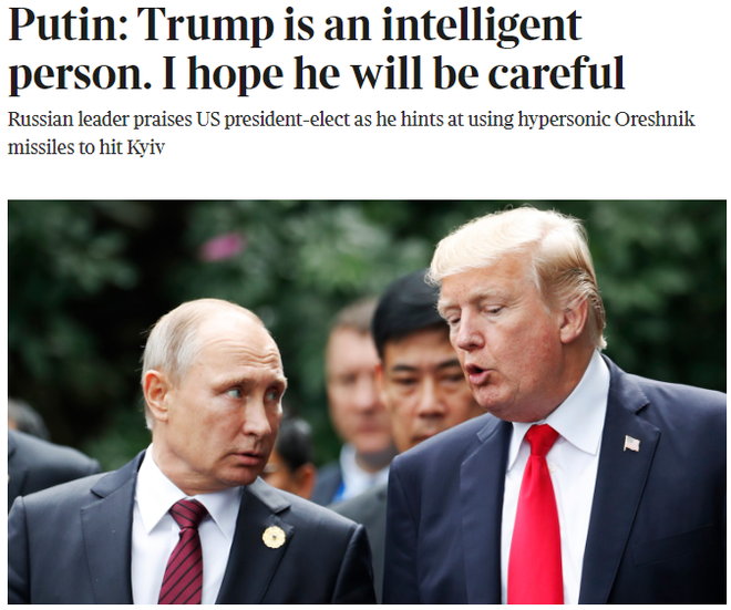 图为《泰晤士报》网站28日的报道:普京:特朗普是个聪明人。我希望他小心点