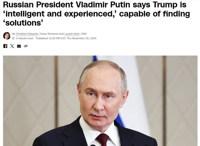 CNN11月28日的报道:俄罗斯总统普京称特朗普“聪明、有经验”,能够找到“解决方案”