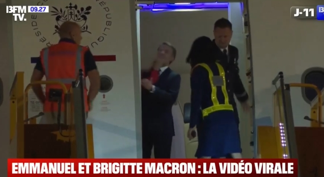 马克龙被妻子打脸,图为法媒视频截图
