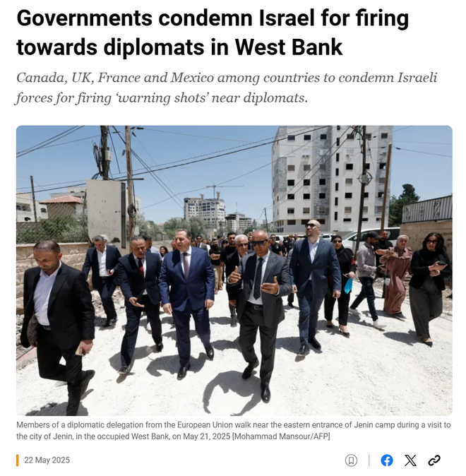 5月22日,半岛电视台报道称,多国对以军向外交使团开枪的行为表示谴责