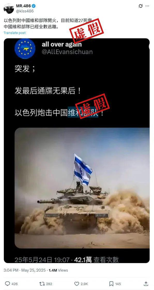 近日,海内外社交平台上有传言称,以色列在5月袭击了中国维和部队,造成27人伤亡。同时间,抖音等平台上还传有一段声称展示了“中国维和部队遭到以色列军队袭击而身亡”的视频。
