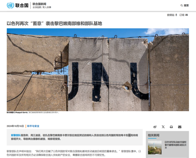 2024年10月,联合国报道称,以色列袭击了黎巴嫩南部维和部队基地