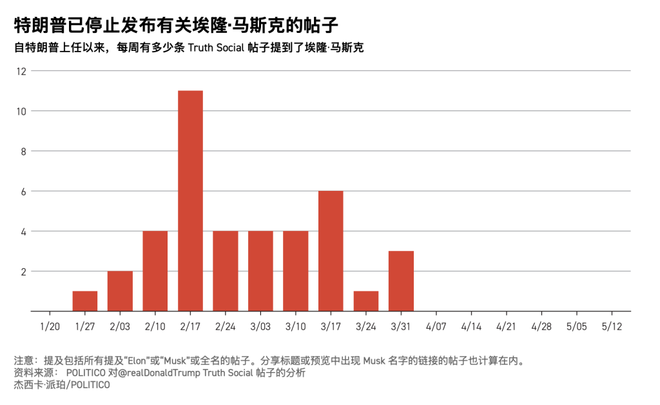 目前,特朗普在其“真相社交”平台上发布有关马斯克的帖子次数急剧下降,从2月和3月的平均每周4次,降至4月初的0次。在竞选筹款邮件中,特朗普团队也开始减少提及马斯克的次数。2月,特朗普的筹款活动在给支持者的邮件中几乎每天都会提到马斯克,此后,特朗普团队只在5月发送过一条提到马斯克筹款信息的消息,推销马斯克试戴的“美国湾”帽子。