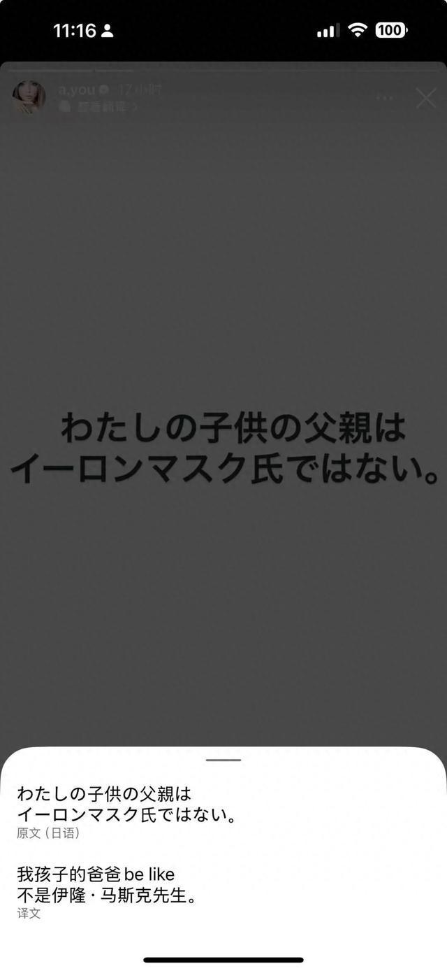 在多篇限时动态中,第一篇写道“我一直在观望,但差不多该说了吧?”接着以白底黑字明确表示:“我孩子的爸爸不是伊隆·马斯克。”