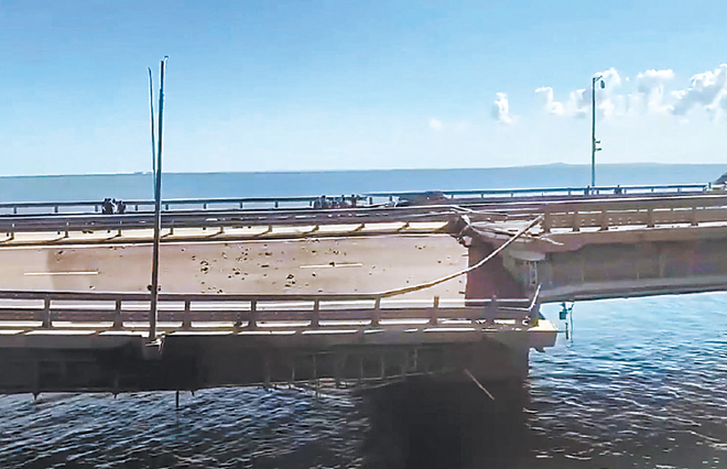 克里米亚大桥17日遭到袭击。图为当地媒体Сrimea24TV拍摄的视频截图,显示大桥路面严重受损。