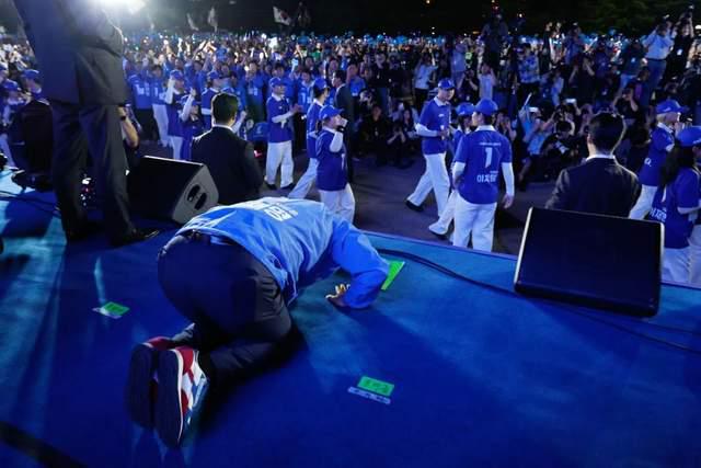 6月2日,竞选集会上李在明跪地鞠躬感谢支持者 图/IC