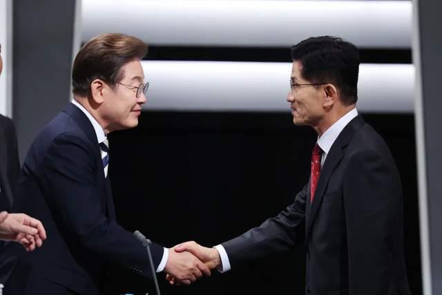 5月23日,总统候选人李在明(左)、金文洙参加第二场电视辩论 图/IC