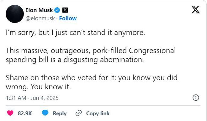 据悉,马斯克当日在社交媒体平台上发布消息称,这项规模庞大的法案“荒谬可笑、充斥着政治操弄”。马斯克称,该法案将使预算赤字大幅增至2.5万亿美元,使美国公民背负难以承受的债务负担。