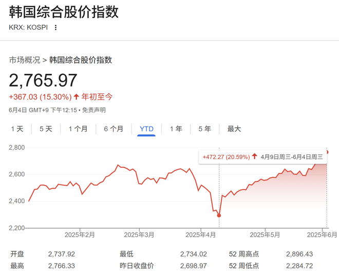 截至目前,韩国基准股指韩国综合股价指数(KOSPI)上涨近2.5%,报2765.97点,较4月创下的近日低点(2293.7点)高出逾20%。这意味着,该指数已经进入技术性牛市。