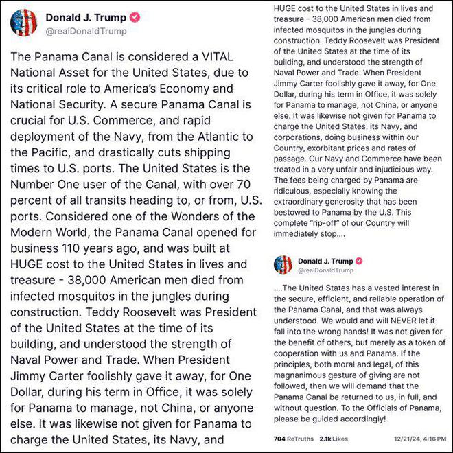 特朗普在社交媒体发文,放话要“收回”巴拿马运河