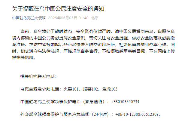 中国驻乌克兰大使馆通知:中国公民做好撤离准备