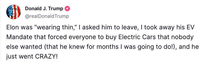 似乎是回应马斯克的批评,美国总统特朗普随后又在其社交媒体平台“真实社交”上发文称,埃隆·马斯克已开始“失去耐性”。特朗普称他要求马斯克离开,撤销了马斯克强推的电动汽车“强制令”,结果“马斯克疯了”。
