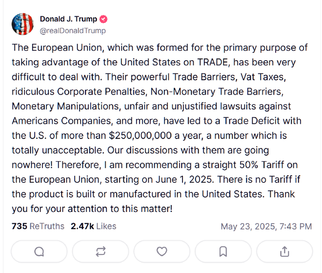 5月23日,特朗普在其创立的社交媒体平台“真实社交”上发文称,建议从6月1日起对欧盟征收50%的关税。特朗普还指责欧盟:“成立的初衷就是为了占美国便宜”。