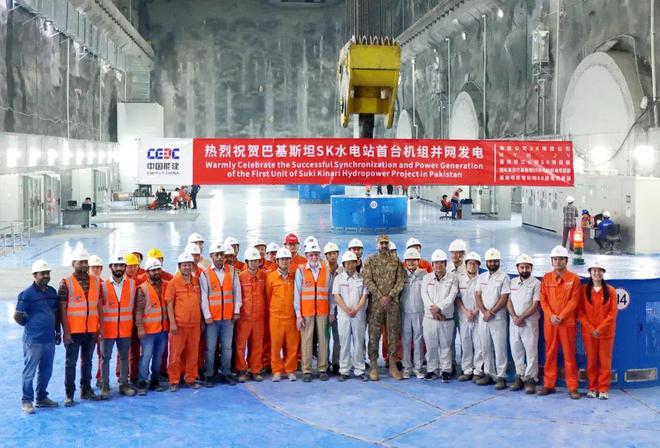 2024年8月12日,中国和巴基斯坦工作人员在巴基斯坦西北部的苏吉吉纳里水电站庆祝首台机组并网发电。该水电站是中巴经济走廊优先实施的重点项目 新华社发 资料图