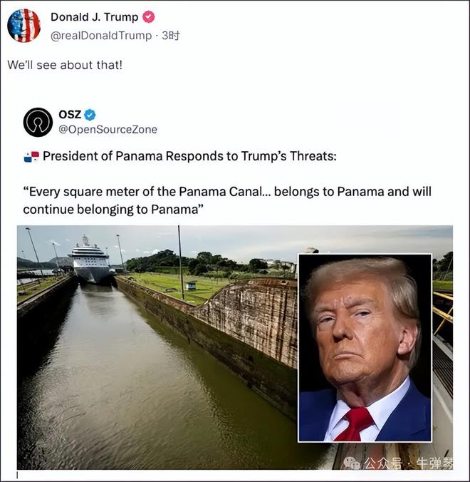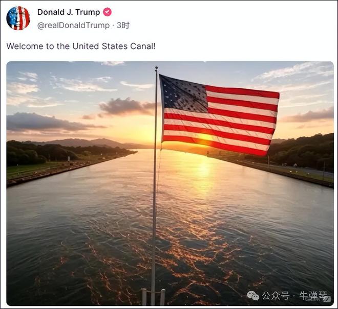 他还贴了一张美国国旗飘扬在巴拿马运河的图片,解释是:“欢迎来到美国运河”。