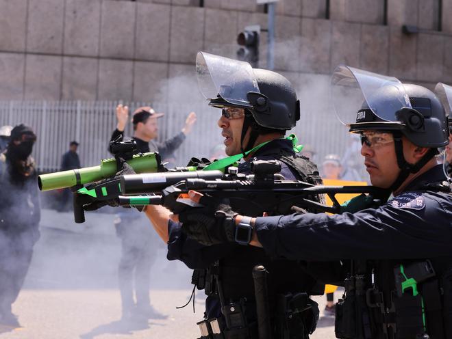 6月8日,在美国加州洛杉矶市中心的联邦执法机构门前,警察试图驱散抗议人群 新华社发(邱晨摄)