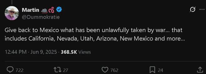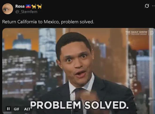 于是,考虑到洛杉矶乃至加州当地遭到美国政府驱逐的非法移民,主要就是来自墨西哥等拉美地区的,而洛杉矶和加州的官方也更倾向于保护这些移民,反对特朗普出动军队的做法,有支持特朗普的美国网民便提出了一个大胆的想法:干脆把加州卖给墨西哥得了。