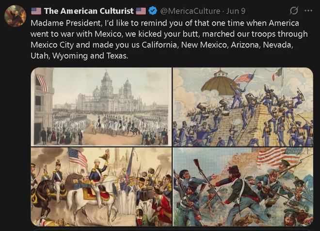但也有美国网民立刻呛声说,墨西哥这个版图是西班牙殖民者打出来的,墨西哥自己没守住不能怪美国。