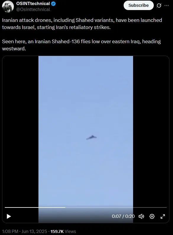 社交媒体上有视频显示,似乎有伊朗无人机飞越伊拉克上空,飞往以色列方向。还有报道称,沙特阿拉伯和约旦境内拉响了空袭警报。