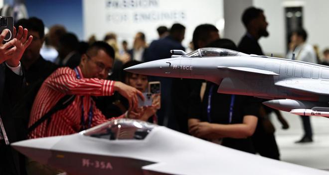 6月17日,在法国巴黎近郊布尔歇机场举行的第55届巴黎航展上,人们在中国航空工业集团展台参观歼-35A、歼-10CE等模型。图源新华社