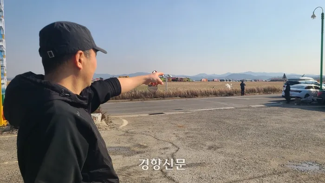 49岁的李根英在距离务安机场跑道300米左右的地方经营餐厅,29日上午一如往常准备开店营业。“我正在准备营业,突然听到几声‘砰砰砰’的巨响,大约响了三四次。”他详细回忆了当时的场景,“我出去一看,飞机正在降落,但和平常不同。我发现飞机并没有顺着跑道方向(按照常规路线)降落,而是从我们店铺上空飞过,感觉很奇怪。”