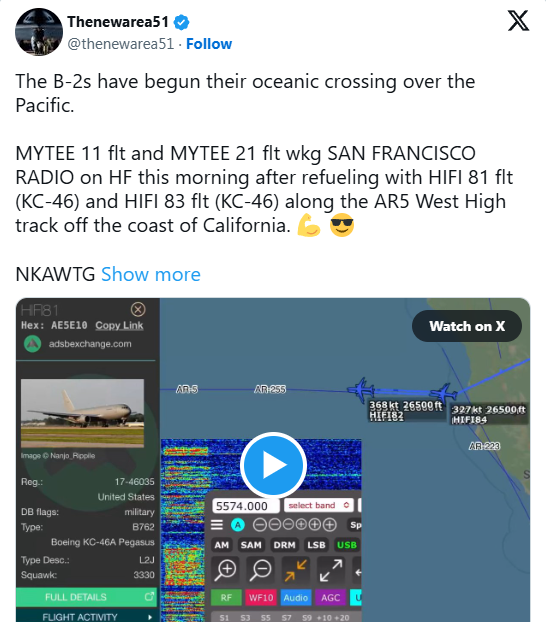 更关键的是,不少媒体注意到,在线航班跟踪数据以及公开的空中交通管制音频显示,有两组使用呼号Mytee 11和Mytee 21的B-2轰炸机于美国当地时间21日早上从怀特曼空军基地起飞,向西开始横跨太平洋之旅。由于这些轰炸机可能携带了能够摧毁伊朗关键的福尔多地下核设施的GBU57巨型钻地炸弹,因此它们起飞后不久就在加州附近的太平洋上空与加油机汇合进行空中加油,随后飞向关岛,这些信息也得到无线电爱好者的证实。