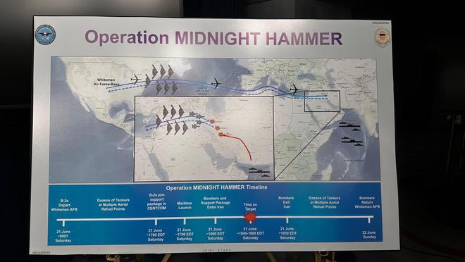 据美国有线电视新闻网(CNN)、英国天空新闻网消息,美国高级官员当地时间22日在五角大楼就美军打击伊朗核设施举行新闻发布会。美军参谋长联席会议主席丹·凯恩称,美国21日针对伊朗的军事行动代号为“午夜之锤行动”,动用了超过125架飞机,并进行了一次“欺骗行动”,将轰炸机部署在太平洋上空作为“诱饵”。