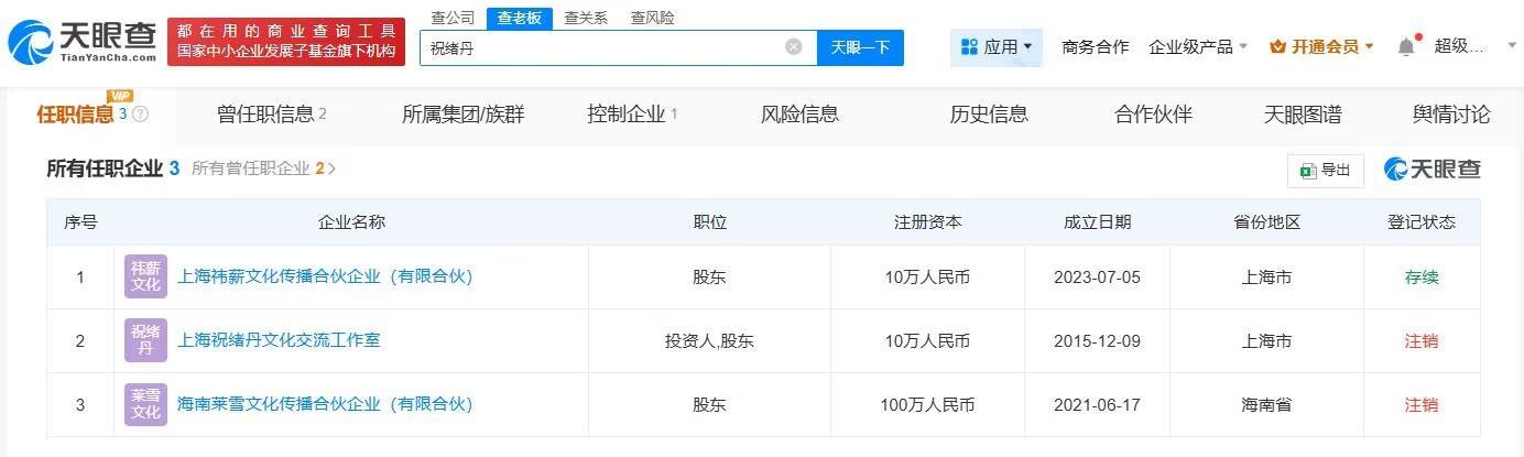 天眼查App显示,祝绪丹名下关联3家企业,仅上海祎薪文化传播合伙企业(有限合伙)为存续状态,其余上海祝绪丹文化交流工作室、海南莱雪文化传播合伙企业(有限合伙)已注销。