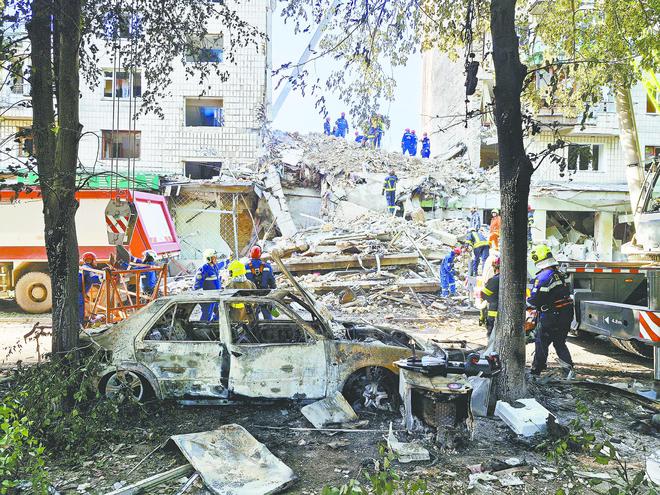 17日,基辅救援人员在一栋遭俄导弹袭击后倒塌的大楼进行搜救
